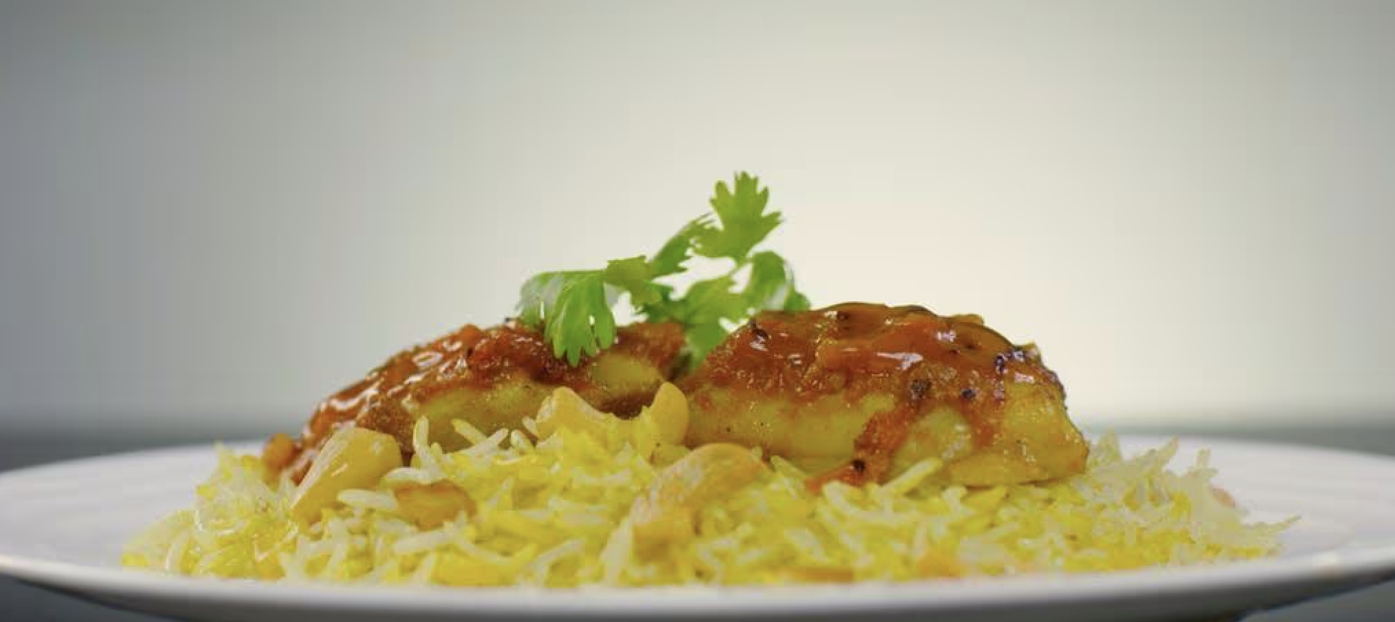 Plate the fluffy spiced rice, top with the roasted chicken thighs, and garnish with crispy potato cubes, toasted cashews, and fresh coriander.